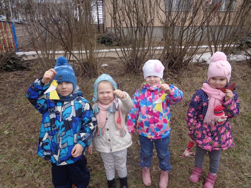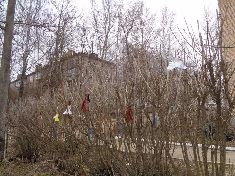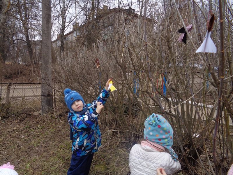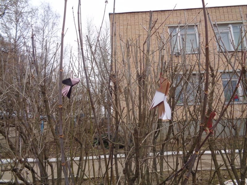 Воспитанники сделали птичек в технике «оригами» и украсили ими свой участок на улице.