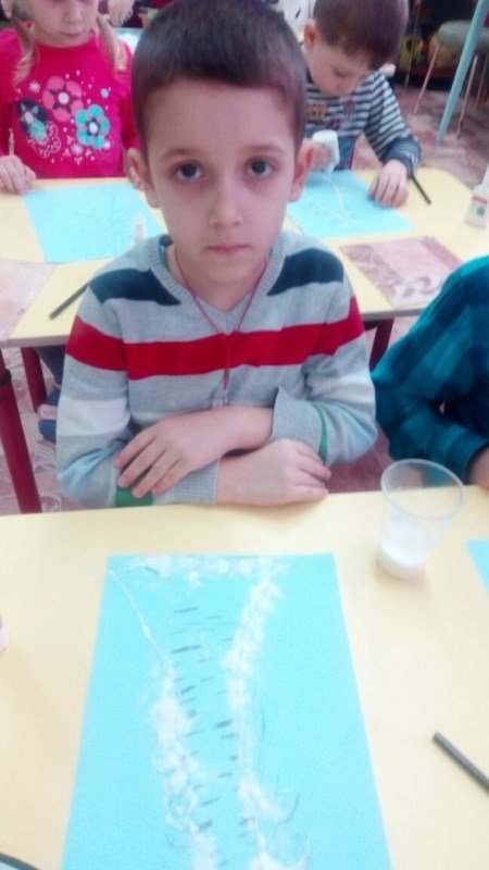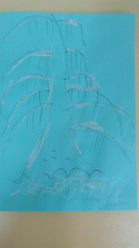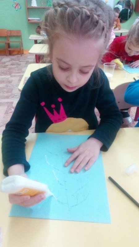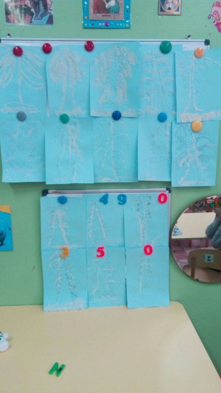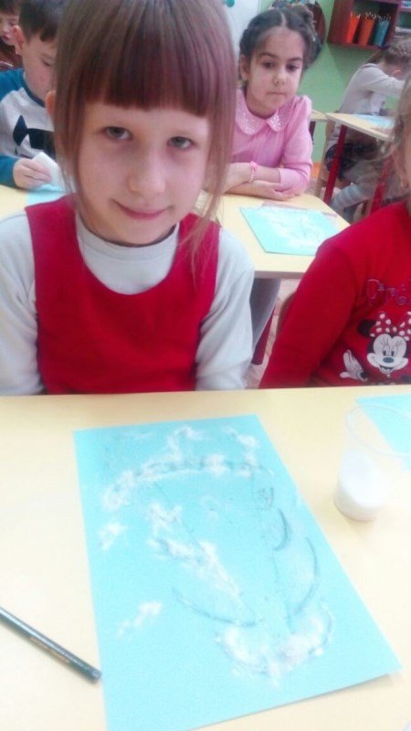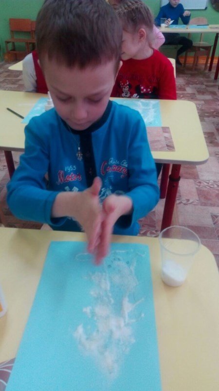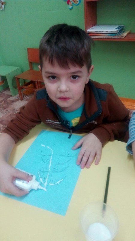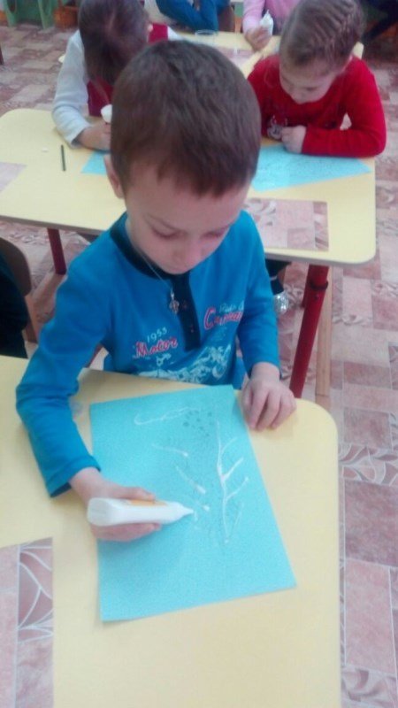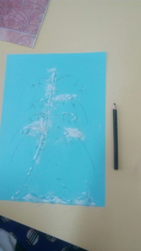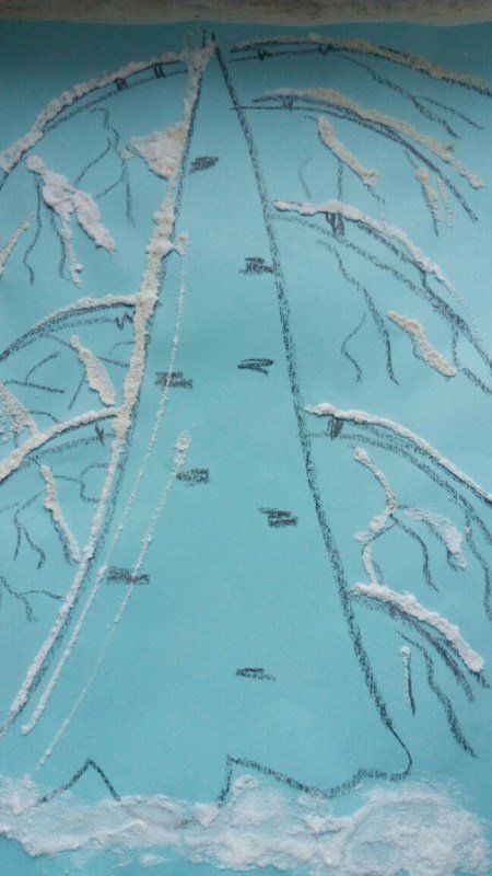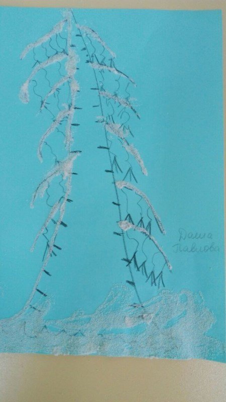 А мы с ребятами решили изобразить березку в зимнем уборе, применяя технику нетрадиционного рисования - рисование манной крупой. К тому же, манная крупа стала не только средством рисования, но и средством самомассажа кистей рук, который очень понравился детям и стал отличным способом релаксации.